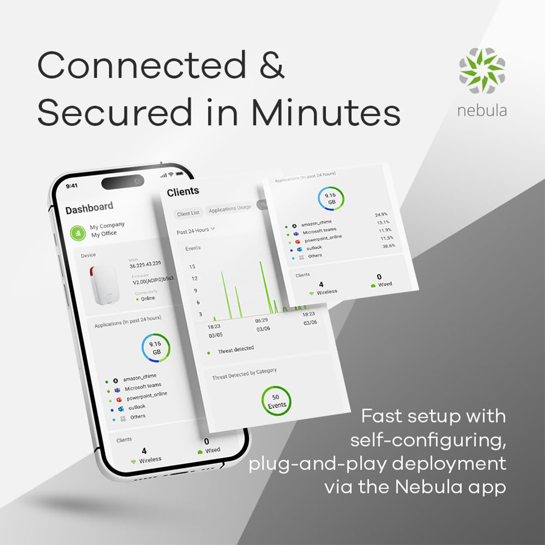 • AI-Powered Cloud Access: Managed by Nebula Cloud with AI-driven insights, centralized management across multiple sites, and remote control from anywhere via the Nebula App